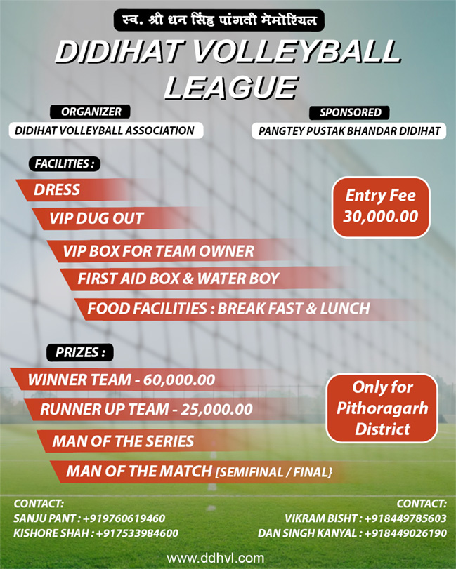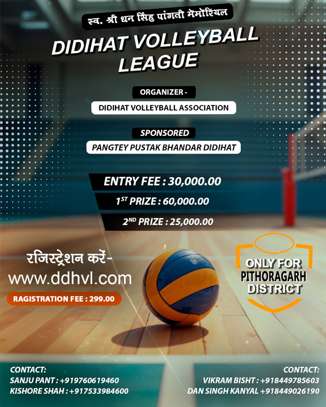 Didihat Volleyball League is a youth-powered sports initiative organized by Didihat Yuva Society. This league is dedicated to the memory of Late Shri Dhan Singh Pangti, who strongly believed in encouraging young talent and promoting sports culture in our region.